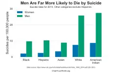 The American Foundation for Suicide Prevention reported that in 2016 suicide was the tenth leading cause of death in the U.S., imposing a cost of $69 billion to the US annually.[17][20] In 2016, middle aged white males were considerably more likely to die than other demographic groups. Native Americans had the highest age-adjusted suicide rate.[17] The suicide rate increased considerably among middle aged white women from 1999 to 2017.[50] In 2024, Black males had a suicide rate four times the rate of Black females.[51]