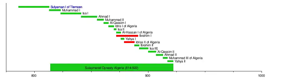 The Sulaymanid dynasty (Arabic: السليمانيون, romanized: as-Sulaymāniyyūn) was an Arab Muslim dynasty in present-day western Algeria, ruling from 814 to 922. The dynasty is named after the founder, Sulyaman I, who was the brother of Idris I, the founder of the Idrisid dynasty based in Fez (present-day Morocco).[1] Both Sulayman and Idris, as great grandchildren of Hasan ibn Ali, were sharifs descended from Muhammad.