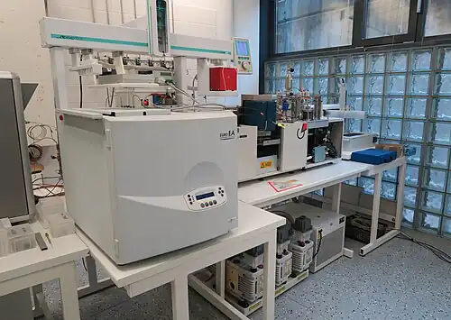 The sulfur isotopic composition of natural samples can be determined by Elemental Analysis-Isotope Ratio Mass Spectrometry (EA-IRMS),[15][16] by Dual Inlet-Isotope Ratio Mass Spectrometry (DI-IRMS),[17] by Multi-Collector-Inductively Coupled Plasma Mass Spectrometry (MC-ICPMS),[18] by Secondary Ion Mass Spectrometry (SIMS),[1][19] or by Nanoscale secondary ion mass spectrometry (NanoSIMS).[20] MC-ICPMS can be paired with gas chromatography (GC-MC-ICPMS) to separate certain volatile compounds in a sample and measure the sulfur isotopic composition of individual compounds.[21][22]