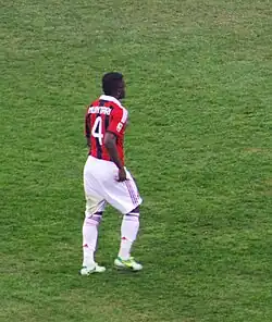 On 31 January 2012, Muntari joined AC Milan on loan.[67][69] On 19 February 2012, Muntari scored his first goal as a Milan player on his debut, in a Serie A away match against Cesena, which Milan won 3–1.[70] On 25 February 2012, with Milan leading 1–0 against Juventus, Muntari appeared to have doubled Milan's lead with a header from a cross by Urby Emanuelson, however the goal was not given by referee Paolo Tagliavento despite the ball crossing the line while being saved by Gianluigi Buffon; the match ended 1–1.[71] On 2 May 2012, Muntari scored a goal against Atalanta in a game that ended 2–0, bringing Milan one point behind leaders Juventus. Juventus eventually went on to win the Serie A title that year, beating Milan to the Scudetto by four points.