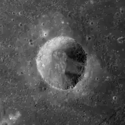 About 10 kilometers to the south and east is the Montes Haemus range that forms the edge of the Serenitatis basin. This crater has a relatively high albedo, with a sharp-edged rim that displays little appearance of wear. There is a small rise at the midpoint. Recent deposits of highland material have been observed within the crater interior. This material was observed to be orange by Apollo 17 astronauts during their LMP ascent.[2]