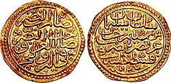 The sultani (Ottoman Turkish: سلطاني) was an Ottoman gold coin. It was first minted in 1477–78 during the reign of Mehmed II (r. 1451–1481), following the Venetian ducat standard,[1] weighing about 3.45 grams (0.111 ozt). The sultani is the classic Ottoman gold coin also known generically as altın (آلتون, "gold").