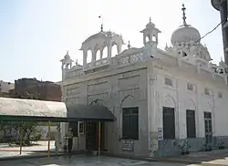 Constructed in the 1970s, honours the memory of Bebe Nanaki, elder sister of Guru Nanak. The actual house, a three storeyed old building where Bebe Nanaki is believed to have lived with her husband, Jai Ram, is inside the old town in Mohalla Chhimbian. But the premises being in private possession, a public monument (cornerstone, laid on 13 November 1970) was raised in the form of a Gurdwara by Bebe Nanaki Istri Satsang Charitable Trust under the chairmanship of Bibi Balvant Kaur of Birmingham (United Kingdom). The Gurdwara Bebe Nanaki Ji comprises a central hall, with the Guru Granth Sahib seated in a white marble palaki at the far end. The Guru Granth Sahib is also seated in a small side room symbolizing Bebe Nanaki's own lodging. Over the sanctum, above the hall roof, is a square domed room with arched copings. Bulbous domes adorn corners of hall roof.