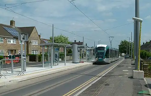 Summerwood Lane is a tram stop on the Nottingham Express Transit (NET) network in the city of Nottingham suburb of Clifton. It is situated on street track within Farnborough Road close to its junction with Summerwood Lane, and comprises a single island platform situated between the tracks. The stop is on line 2 of the NET, from Clifton via the city centre to Phoenix Park. Trams run at frequencies that vary between 4 and 8 trams per hour, depending on the day and time of day.[1][2]
