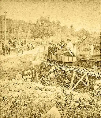 One of the cars used on this road was a platform, about 2 feet (0.61 m) wide and 5 feet (1.5 m) long, and the diameter of the wheels was 5 inches (130 mm).[2] The weights of the cars were 100 and 150 pounds (45 and 68 kg), carrying more than six times their own weight, at a speed of 25 miles per hour (40 km/h). The fastest time made was 45 seconds, including starting and stopping.[1]