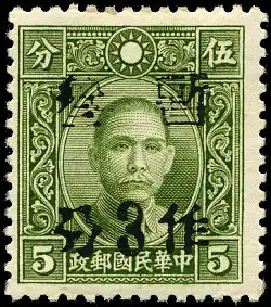 The Japanese occupation of large parts of China during the war resulted in a great number of overprints and surcharges, mostly for use within a limited region. A number of these stamps received further overprints when the territory was recaptured from the Japanese.
