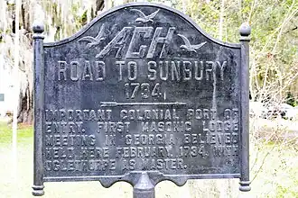 Following the war, in 1784,[3][17] Sunbury became the first county seat for Liberty County.[15][3] In February 1788, the Sunbury Academy was authorized and established several years later in 1793.[1] The school, located in King's Square, operated for about the next 40 years and was considered one of the most famous schools in the southern part of the state.[1] It was headed by The Reverend Dr. William McWhir, who was a friend of George Washington.[15] The town was officially incorporated on December 8, 1791,[1] during a time when other cities in Georgia, such as Augusta and Brunswick were also gaining self-government.[18] In 1792, Sunbury Road was laid out,[1] which made it easier for farmers in the area to transport their crops to the port.[9] The road connected Sunbury to Greensboro, Georgia, and was the longest vehicular route established in the state following the Revolutionary War.[1] In 1793, a post office was established in the town.[19] However, in the late 1790s, the county seat was transferred to Riceboro.[note 4] In 1804, the town was hit by a strong hurricane, and by the early 1800s, it had lost much of its trade to Savannah.[12]