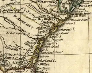 The town had a shipyard, a manufacturing center that produced shingles and staves, and a causeway connecting it to nearby Colonels Island, which served as an important center for Indigo dye production in the region before the market crashed in 1808.[3] This causeway was repaired annually in the fall by slaves who had been requisitioned by the local government.[10] Additionally, the town and island had a sizeable lumber industry, exporting wood to other ports throughout the West Indies.[9] The area attracted a large number of immigrants, including a sizeable number of people from Bermuda.[9] At one point, a canal was considered that would have connected the Midway River and Newport River through the area separating Colonels Island from the mainland in order to make it easier for plantations in the area to transport their rice crops to Sunbury.[9] However, this never came to fruition,[9] and instead planters further inland created a plan to bridge the Newport River near its source in order to directly transport their rice yields to Savannah.[11] While Sunbury was opposed to this plan, fearing it would hurt their port's economy, the bridge was constructed, with a settlement emerging around the bridge known as Riceboro.[11] In 1772, 56 ships were recorded as having accessed the port, and on at least one occasion, slaves from Africa were brought and sold at one of the wharves.[3] Many planters who owned plantations in the area had houses in Sunbury in which they lived during the summer and fall seasons,[3][9] typically arriving in June and leaving in November.[12] In 1773, the naturalist William Bartram wrote about a visit he had to the town, describing it as "beautifully situated on the main" with a "capacious and safe" harbor that had "water enough for ships of great burthen".[2]