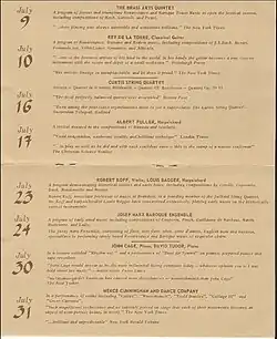 The festival took place in the months of July and August. There were two performances weekly, Friday and Saturday nights, solely dedicated to chamber music, modern dance, drama, poetry readings, and film. Admission was $2.00 per concert.