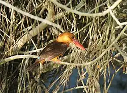 Birds are plentiful with over 270 having been recorded in the area including 38 species of raptor, 95 species of waterfowl and 9 of kingfisher. On the coast there are gulls and terns, on the mudbanks waders are plentiful and various forest birds are found among the trees.[1] Some of the birds recorded such as the masked finfoot (Heliopais personatus) and the white-rumped vulture (Gyps bengalensis) are threatened globally. The greater spotted eagle (Clanga clanga) overwinters here but the lesser adjutant (Leptoptilos javanicus) is a resident but uncommon species as is the mangrove pitta (Pitta megarhyncha) and the black-headed ibis (Threskiornis melanocephalus). The streak-breasted woodpecker (Picus viridanus) is at the western end of its range here. Other notable birds include the great stone-curlew (Esacus recurvirostris) and the buffy fish owl (Bubo ketupu).[4]
