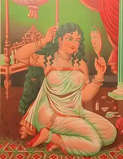 Pramoda Sundari images depict a woman sitting with several grooming products, brushing her hair while holding a mirror before her face. The paintings show an objectified representation of women engaged in self-care.[1][2]