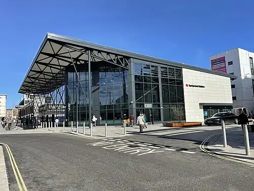 In October 2015, it was announced that plans were being formulated for the refurbishment of the upper concourse and exterior to improve the station's image and accessibility.[18] Almost six years later, in July 2021, revised plans for the refurbishment were revealed – with an estimated cost of £26 million.[19][20][21][22] The six-year project would see the station's south entrance demolished and rebuilt, with the number of tracks passing through the station to be increased to four. Preparatory work commenced in April 2022, with the new southern entrance set to open in early 2023.[23][24][25]