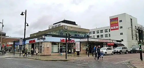 The redeveloped station was designed by Frederick Francis Charles Curtis of the British Rail Architects' Department,[7][8] with construction completed on 4 November 1965. At the time, the development formed part of a complete rebuilding scheme involving almost the entire area of the station site, which was decked over and developed at street level. A single entrance and street-level buildings were located at the northern end of the station, with a second entrance and associated buildings at the south being added five years later.