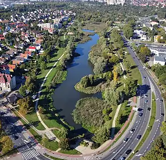 It forms the central point of the Adina Blady-Szwajger Park (Polish: Park Adiny Blady-Szwajger), also alternatively known as the Green Square Park (Polish: Park Zieleniec). Its a small urban green area surrounding the lake.[2][3]