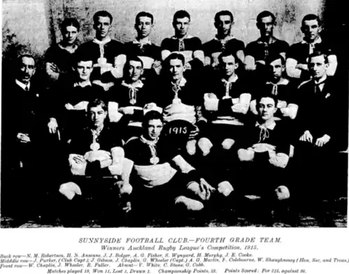 Then on May 16 Sunnyside took the field officially for the first time. Their second grade side was drawn to play Northcote but defaulted the match and then withdrew from the competition.[10] Their 3rd grade A team played Newton at Devonport Domain at 3pm, while their 3rd grade B team had a bye. Sunnyside's 4th grade side played North Shore at Devonport Domain, and as their match kicked off at 2pm they became the first ever Sunnyside team to play an official match.[11] The two teams to take the field for the first time in the clubs history were: Third Grade A – Gordon Spraggon, W. Parker, L. Fraser, Philip Onslow Arthur Willetts, William Roy Jaggs, E. Black, Leslie Arthur O’Leary, Charles Bramwell Sinton, W. Dalton, C. Happer, C. Marks, Gordon Lepine, and Eric Spraggon. While the Fourth Grade side was – J. Taine, R. Fuller, J. Wheeler, W. Manning, W. Davern, T. Black, F. Taine, John Charles Alexander Chaplin, J.J. Bolger, J. O’Shaunessey, P. Vos, G. Cobb, T. Chaplin, and Jones.[12] The 3rd grade A side lost 17-0 and the 4th grade team lost 12–0. The 3rd grade B team to play in mid June was listed as A. Martin, H. Thompson, C. Gray, A. Bright, H. White, H. Gibbons, K. Manning, Temperton, E. Jones, S. Jones, Darragh, McQuillan, Bayley, Morris, T. Edkins, F. Gallaher, and A. Pratt.[13] As they played in the lower grades there was very limited newspaper coverage, usually restricted to fixture lists, team lists, and scores, which were often not reported either. On the 20th of June the 3rd grade B team played three men short and lost to Remuera 31 to 0.[14] On July 4 Sunnyside and North Shore held a charge day at the Devonport Domain to raise money. Sunnyside 3rd grade A lost to City Rovers 17 to 12, and their 4th grade side lost to Newton Rangers 12 to 6.[15][16]