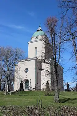 The Suomenlinna Church (Finnish: Suomenlinnan kirkko, Swedish: Sveaborgs kyrka) in Helsinki, Finland, was built in 1854 as an Eastern Orthodox garrison church for the Russian troops stationed at the Suomenlinna sea fortress. The fortress comprises five islands joined together by bridges, and the church is the central feature on the island of Iso Mustasaari (Swedish: Stora Östersvartö), located at its highest point. It is surrounded by other fortress buildings, but the old parade ground is immediately to the east, and a park lies immediately to the south. It is oriented southwest to northeast so that it would align with the Crownwork Ehrensvärd defense front located to the southwest of the church.