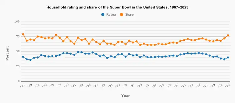 Ratings for the Super Bowl first peaked from 1977 to 1987, when no less than 44.4% of American households with television sets would watch.[5] From the late 2000s to mid-2010s, ratings peaked again—viewership grew for all but one broadcast from 2006 to 2015. This was attributed to the NFL's broadened appeal to female and Hispanic audiences, as well as the league's ability to prop up "high-profile" players in the media;[9] female viewership grew every year from 2003 to 2008.[10] However, the 2019 game became the least-watched in more than a decade and the household rating for the Super Bowl declined for the fourth consecutive year.[11]