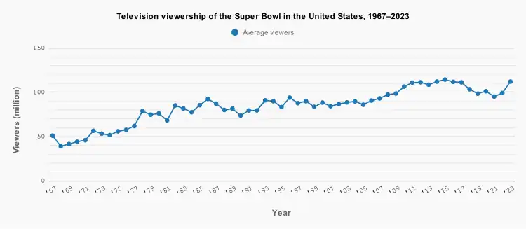- ^ "Global audience of 62.5 million watched Super Bowl LVIII, an increase of 10 percent over 2023". NFL. March 6, 2024. Retrieved February 9, 2025.