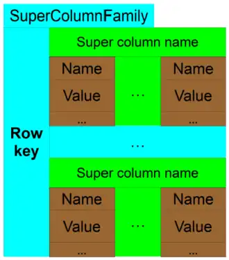 [...] the largest container, the SuperColumnFamily, if you understand the ColumnFamily then this construction isn't much harder, instead of having Columns in the inner most Map we have SuperColumns. So it just adds an extra dimension. As displayed in the image, the Key of the Map which contain the SuperColumns must be the same as the name of the SuperColumn (just like with the ColumnFamily).