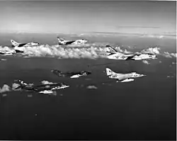 An 803 NAS Scimitar from HMS Hermes with US Navy A-4s, F-8s and an F-4 over the Mediterranean Sea