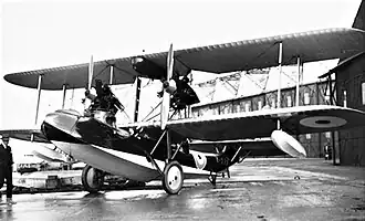 The design incorporated two 238 horsepower (177 kW) geared Armstrong Siddeley Lynx IV radial engines driving wooden tractor propellers.[7] The fuel, stored in a tank mounted on the top plane, was fed by gravity to the engines. According to a 1929 article in Flight, the fuel load of 135 imperial gallons (610 L; 162 US gal) of petrol was estimated as providing the aircraft with a range of around 300 miles (480 km).[8]