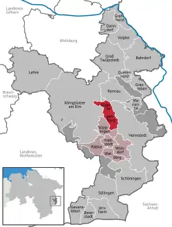 Saxony-AnhaltBraunschweigGifhorn (district)Wolfenbüttel (district)WolfsburgBahrdorfBeierstedtBrunsleberfeldDanndorfFrellstedtGevenslebenGrafhorstGraslebenGroß TwülpstedtHelmstedtHelmstedtHelmstedtHelmstedt (unincorporated area)JerxheimKönigslutter (unincorporated area)Königslutter (unincorporated area)KönigslutterKönigslutterKönigslutterLehreMarientalMariental (unincorporated area)Mariental (unincorporated area)Mariental (unincorporated area)QuerenhorstRäbkeRennauSchöningenSchöningen (unincorporated area)SöllingenSüpplingenSüpplingenburgVelpkeWarbergWolsdorf
