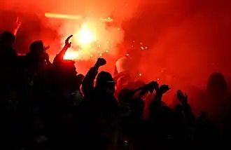 They are known for their devotion and support for Benfica, especially in football and futsal.[64][65] Moreover, some of its members sometimes engage in protests against the club's board, staff, or players whenever they feel things are not right. Those protests can be silent presences at matches or explicit criticism at the club's members meetings.[66][67][68]