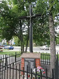 On 22 November 1992, on the intersection of Wólczyńska Street and Wolumen Street was unveiled a metal Christian cross, and a plaque, commemorating the events of the Suppression of Wawrzyszew. The plaque includes names of 34 identified victims killed during the event, and additionally is dedicated to the unidentified civilians and soldiers of the Home Army, who were buried at the nearby Wawrzyszew Cemetery.[6]