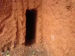 Once the flow is detected, the digging of the surangas is carried out by manual labourers or by the villages themselves with the help of improvised digging tools like pick axes and wedges.[5] The digging takes places mainly during the dry season, in between February and May, to prevent collapsing of wall due to presence of moisture in the soil.[8] The tunnels are generally rectangular or dome-shaped with an optimal height and width which allows a man to work and pass comfortably.[1]: 662 The tunnels are made with a downward slope to use the gravitational force for collection of the water percolating outside.[9] During construction, lining of walls is provided to prevent collapsing of wall due to loose or soft soil.[1]: 662 While an average suranga is 26 metres (85 ft) meters deep,[1]: 662 surangas up to 250 metres (820 ft) meters deep have also been recorded.[10] Air shafts are constructed in longer surangas to supply fresh air and to expel poisonous gases.[1]: 662