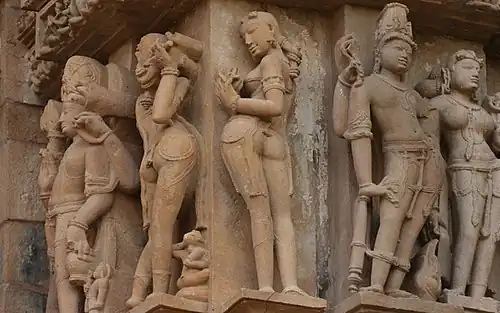 Buddhist and Jain shrines have featured sensual figures in form of yakshis and other spirits since 2nd century BCE. However, the surasundari motif gained prominence in Indian temple architecture only around the beginning of the 9th century CE. Shilpa-Prakasha, a 9th-century Tantric architectural treatise, declares a monument without a surasundari as inferior and fruitless.[1][3] The 15th century text Kshirarnava states that the surasundaris should be depicted looking down (adho-drishti), not looking at someone.[4]