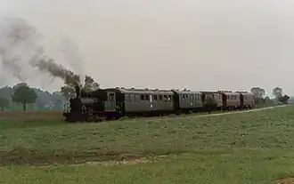 Freight traffic continued and in 1976 a second diesel of SBB Tm IV type arrived. When the nostalgia-boom reached Switzerland, ST gave its steam 8522 engine to the Dampfbahn Bern which gave it an overhaul and used it for some time. Having kept the old passenger coaches, ST began to offer steam train runs. Remarkable thing is that 8522 is one of the two locomotives that were "partly electrified" during World War 2. An electric boiler heating was fitted to save on coal, but when the war was over and supply restarted, pantograph and electric heater were removed.[1]