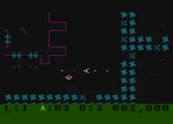 The player can be destroyed by the fortress guns, or any of the numerous moving enemies. These enemies can be destroyed with the ship's gun, or by using up one of the smart bombs, which destroy all of the enemies on the screen. Some enemies are also blocked by the protective wall, making them easy to avoid by shooting open only small passages in the walls. Others can move through the walls and present more of a challenge. Since some of the fort guns can only be attacked from angles that demand additional holes be punched in the walls, the play can become hectic.