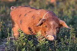 Pigs were also domesticated in China, potentially more than once.[31] In some parts of China pigs were kept in pens from early times, separating them from wild populations and allowing farmers to create breeds that were fatter and bred more quickly.[32] Early Modern Europeans brought these breeds back home and crossed them with their own pigs, which was the origins of most modern pig breeds.[33]