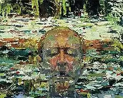 Coffey is best known for her paintings of heads―often self-portraits, such as her Self Portrait, Versace (Canal) Scarf in the collection of the Honolulu Museum of Art. Like many of her paintings, this 1996 self-portrait is a frontal view, lit from behind. Hearne Pardee describes her practice in the Brooklyn Rail:
