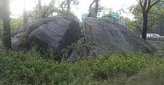 Susanna's widowed mother was frightened at the prospect of Massachusetts gaining influence or control over Rhode Island. Consequently, she moved to the part of New Netherland that later became The Bronx in New York City, along with her six youngest children, an older son, a son-in-law, and some servants.[7] The Dutch were engaged in Kieft's War against the Siwanoy Indians during the family's tenure there. In August 1643, Siwanoy attacked the emigrant household and killed all members of the family, except for nine-year-old Susanna. According to one story, Susanna's red hair spared her from the slaughter,[8] while another account claimed that the girl was out picking blueberries some distance from the house and hid in the crevice of Split Rock.[9] In any event, the attackers took her captive and held her for several years.[10]