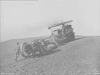 Holt caterpillar tractor towing a 6-inch howitzer in the Middle East, 1918.
