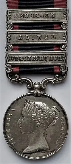 The Sutlej Medal was a campaign medal approved in 1846, for issue to officers and men of the British Army and Honourable East India Company who served in the Sutlej campaign of 1845–46 (also known as the First Anglo-Sikh War). This medal was the first to use clasps to denote soldiers who fought in the major battles of the campaign.[1]