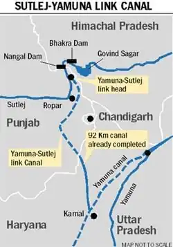 Satluj Yamuna Link Canal or SYL as it is popularly known, is an under-construction 214-kilometer (133 mi) long canal in India to connect the Sutlej and Yamuna rivers.[2] However, the proposal met obstacles[3] and was referred to the Supreme Court of India.[2] It was defined as river water sharing between the states of Punjab and Haryana.