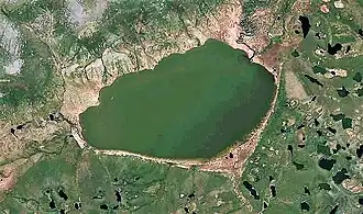 The lake is located in the Aby Lowland —part of the wider East Siberian Lowland, by the southeastern slopes of the Polousny Range,[2] a short distance to the west of Lake Ozhogino.[3] Suturuokha village lies to the southeast of the lake. It is one of the three largest lakes of the 15,000 Aby Lakes. There is an island formed by stones in the central area of the lake which has become a nesting site for birds.[4]