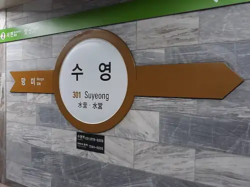 Suyeong Station is a station on the Busan Metro Line 2 and Line 3 located in U-dong, Suyeong District, Busan. The station is unrelated to the Centum station operated by Korail.