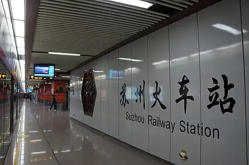 Suzhou railway station (Chinese: 苏州火车站) is a station on Line 2 and Line 4 of the Suzhou Metro. The station is located at the Suzhou railway station in Gusu District of Suzhou. It started service on December 28, 2013 with the opening of Line 2.[1][2][3]