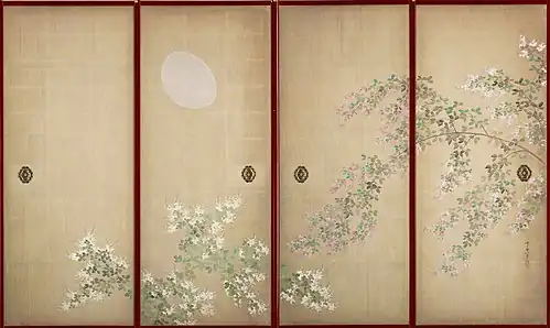 Moon with Bush Clovers (萩月図襖) is a pair of two sliding doors made using color on silk.[23] The work represents a scene of nature with bush clovers and an abstracted moon. Similar in style and color to the Wind God and Thunder God doors, it also belongs to the Rinpa tradition of folding screens with images of nature. In particular, it resembles Hōitsu's Autumn Flowers and Moon screens.