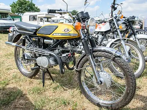 The second version of the T125 was known as the Stinger in most markets, it was also marketed as the Wolf in Japan, New Zealand and parts of Australia. In the rest of Australia and France it was called the Flying Leopard. It was Suzuki's interpretation of the American 'canyon racer'.[5] The bike was based around the space frame of the TC120 Tail Cat. The frame was called the Triform by Suzuki.[6] As the frame had been designed for the Trail Cat's single cylinder engine, the wider twin engine would have been too wide to fit between the frame tubes. To overcome this, Suzuki slated the cylinders forward, almost horizontally, so they sat in front of the frame tubes. The model was also available with a 90 cc engine, the T90.[5]