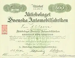Svenska Automobilfabriken (SAF) was a Swedish car manufacturer founded in Bollnäs in December 1919. It assembled US cars based on Pullman Motor Co chassis bought when Pullman went bankrupt in 1917, and fitted them with coachworks and adapted them for Swedish conditions. The engine was a Golden, Belknapp & Swartz giving 32 hp. It was fitted with a Stromberg carburettor and had a 50-litre gasoline tank. People who earlier had worked on Rengsjöbilen were among the employees. SAF bought 40 Pullman chassis, and built 28 SAF cars before the company went bankrupt in 1921. The remaining stock (with or without bodywork) was sold out over a few years.[1][2]