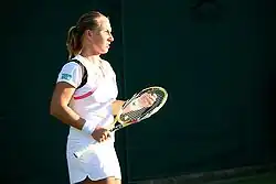 Kuznetsova reached the third round of the singles competition at the Australian Open, before losing to top seed Justine Henin. She reached her second major doubles final with new partner Elena Likhovtseva before losing to Virginia Ruano Pascual and Paola Suárez.[20] Several weeks later, playing singles at Dubai, Kuznetsova defeated former world No. 1, Venus Williams, in the quarterfinals before defeating world No. 8, Ai Sugiyama, in the semifinals for her first win over a top-10 player. Kuznetsova lost the final to world No. 1 Henin.[21] The following week, Kuznetsova defeated Henin for the first time in the semifinals of Doha, before losing in the final to compatriot Myskina in three sets,[22] pushing her into the top 20 for the first time. In April, Kuznetsova reached her third singles final of the year at the start of the clay-court season at the J&S Cup in Warsaw, losing to Venus Williams in the final.[23] Kuznetsova climbed to No. 11 by the time of the French Open. There, she reached the fourth round before losing to eventual champion Myskina, after holding a match point in the third set. In doubles Kuznetsova and Likhovtseva reached the final, losing to Suarez and Ruano Pascual.[24] Following the French Open, Kuznetsova climbed to career-highs of world No. 9 in the singles rankings, her first time in the top ten, and on 7 June 2004, world No. 3 in the doubles rankings. Kuznetsova won her third title at the Eastbourne International, defeating Hantuchová in the final in three sets.[25] At Wimbledon, Kuznetsova suffered a first-round loss to 118th–ranked Virginie Razzano.[26] She fell to No. 4 in the doubles on 26 July, losing in the LA Women's Tennis Championships to 113th ranked Gisela Dulko and Patricia Tarabini.