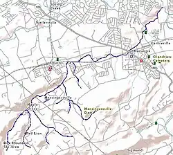 A tributary of the west branch flows past the village of Red Lion and joins the primary branch and another tributary in the village of Maple Grove. The west branch of Swabia Creek then runs along the Lock Ridge south face.[2] The east branch passes through Hensingersville Dam.[3] The east and west branches connect in Hensingersville. Swabia creek then runs north to Alburtis through Lock Ridge Park. The creek turns east, running roughly parallel to railroad tracks.[4][5][6]