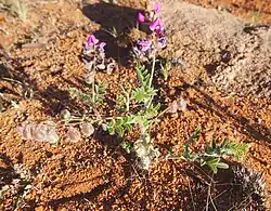 This Swainson-pea grows on sandy or loamy soils on stone and sandplains in the north of South Australia, in the Central Ranges, Finke, Great Sandy Desert, Great Victoria Desert, MacDonnell Ranges, Stony Plains of southern Northern Territory, and the Central Ranges, Gascoyne and Great Sandy Desert bioregions of Western Australia.[2][3][4]