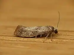 The wingspan is 9–13 mm. The head is white. The thorax is white, sometimes anteriorly fuscous-sprinkled. Forewings are white, irregularly irrorated with fuscous; some longitudinal series of blackish dots; antemedian dark fuscous fascia reduced to two spots, discal and dorsal; two white spots on costa posteriorly, separated by a dark fuscous spot; cilia coppery-tinged, with two dark purplish-fuscons lines. Hindwings are pale fuscous. The larva is reddish-brown; dorsal line broad, paler, becoming indistinct posteriorly; spiracular broad, yellowish-white; head pale yellow-ochreous.[4]