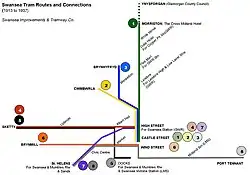 In 1905, following a failed attempt to take over the tramway, Swansea Corporation won the right to build several new lines but had to give the running powers to the SITC.[4] Glamorgan County Council, meanwhile, built an extension northwards from Morriston to Ynysforgan (intended to be a new system to Pontardawe but never completed) for which the SITC also provided the cars and electric power.[4] Three further short extensions followed in 1913 promoted by the SITC to link between some of the existing tracks to permit more route variation giving the final route pattern used from then until closure in 1937.