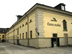 The main building, designed by Romare and Scherman 1935–1940, reflects an ambivalence between the predominant modern style of the era and the historical context given not only by the context requirements, but also the 19th century barracks and stables south of the museum designed by Fredrik Blom and built in stages in 1805–1818, starting one year after the land had been appropriated by the government.[9] The barracks are neoclassicist in style and the repetitive façades used to be exposed to Ladugårdslandsviken that was part of Stockholm's main harbor up until the 19th century,[11] while the main building forms a compact block taking a step backwards from the street to leave space for a forecourt.[12]